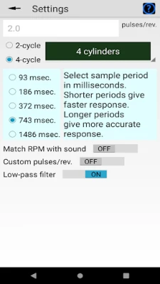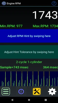 The Engine RPM app is designed to listen to the sound of an engine and from that sound, calculate and display the RPM of that engine. However the app cannot determine the RPM if the sound is inadequate, or if the app has not been properly configured for that specific engine. The sound must be clear and steady and must not have too much noise in the background. The app works the best on engines with minimal or no mufflers, such as motorcycles, lawnmowers, leaf blowers, small aircraft engines, and the like. It works better at high RPMs than at idle. For cars with modern mufflers the app will not be able to measure the RPM near idle, or if the app is listening from inside the car with the doors and windows closed. The sound inside a modern car is much too quiet for this to work.