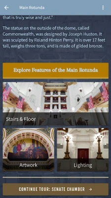 We invite you to explore the Capitol using this self-guided tour. This app will help you navigate through this historic building, highlighting both the history and architecture that make our Capitol unique. Visitors are welcome to explore the Capitol building at their leisure between the hours of 8:30 a.m. and 4:30 p.m. on regular weekdays only.
