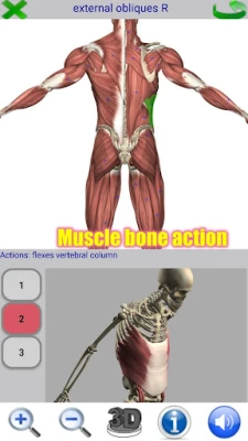 2. One of main sections - Muscles. It have more than 140 muscles including full description (ORIGIN, INSERTION, NERVE, ACTIONS) and cover all superficial muscles and most of deep muscles. 3D muscle overview.